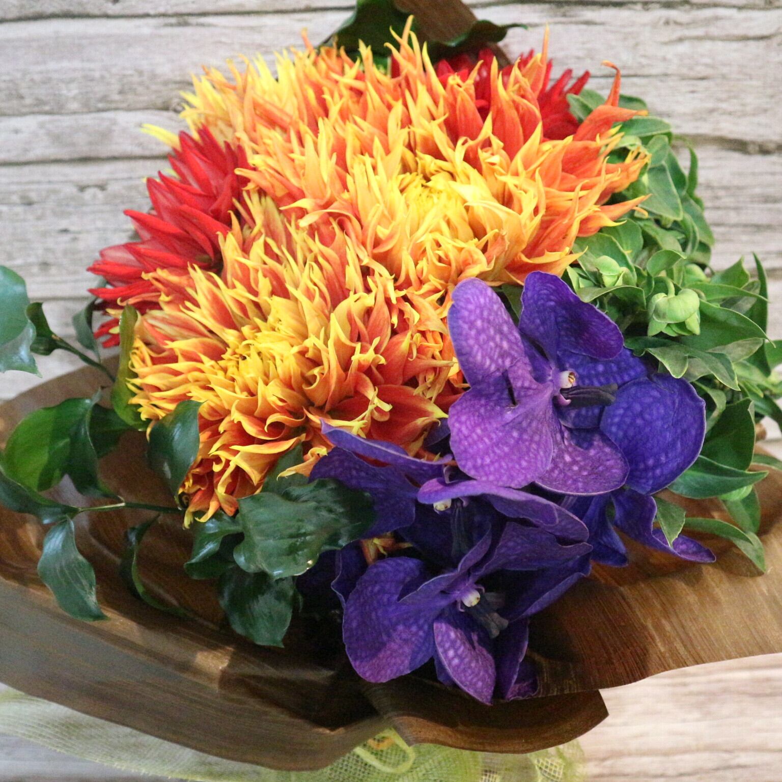 ムンクの代表作「叫び」をイメージしたブーケです。赤く燃えるような夕焼けを秋田県産のダリアで、青暗いフィヨルドをバンダとラスカスで表現しました。