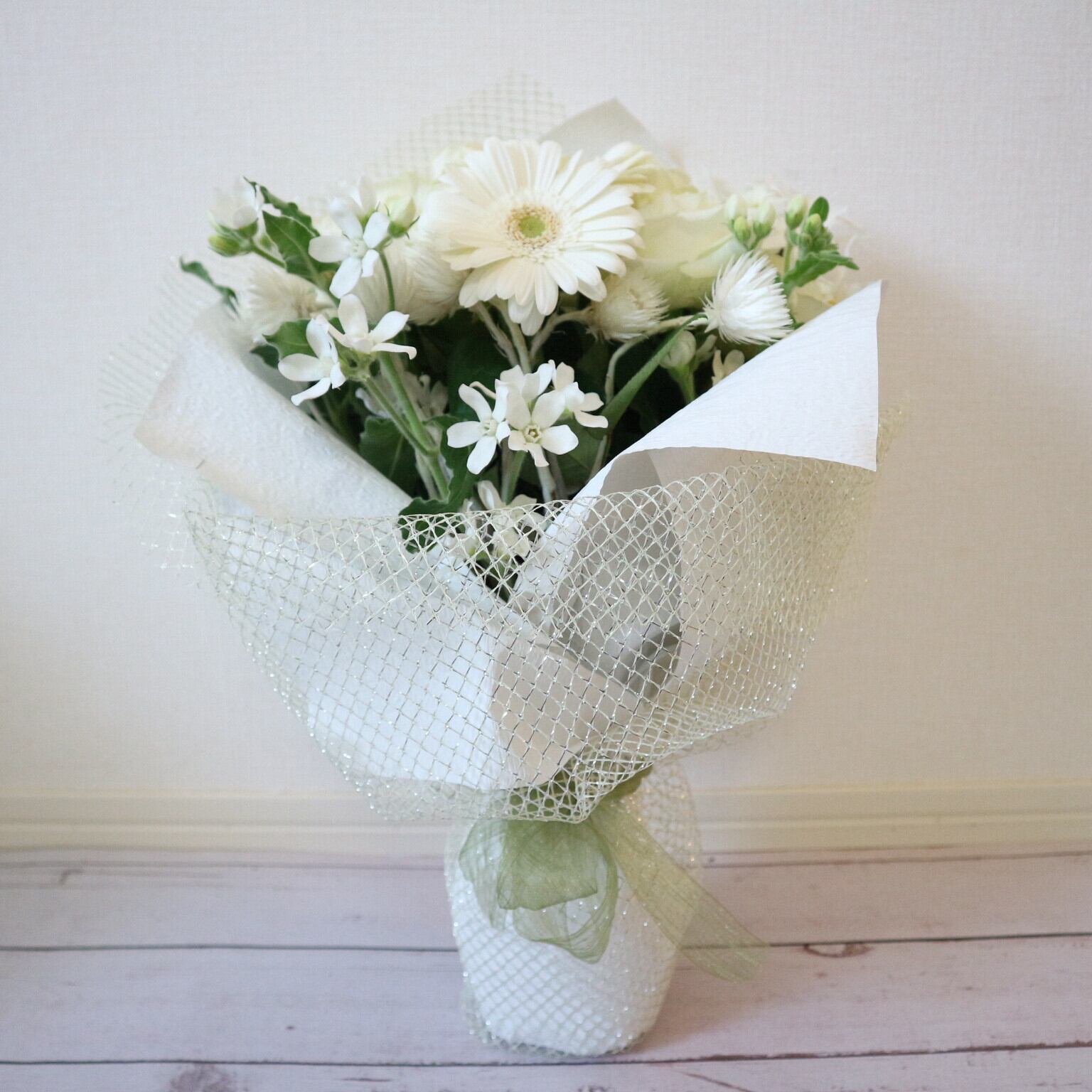 ホワイトの石巻ガーベラに、バラやホワイトスター等白色の花のみを束ね、純白のブーケに仕上げました。