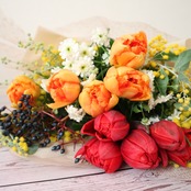 春を象徴するミモザを、2色のチューリップと合わせ明るい春のブーケを作成しました。