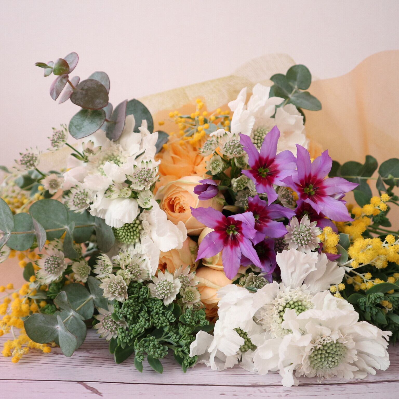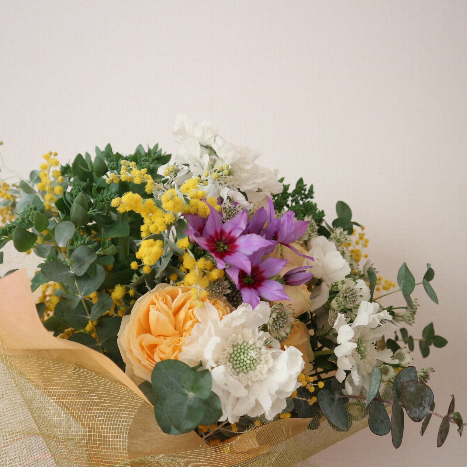 ミモザにバラ、スカビオサ、リューココリーネ等を合わせ、華やかに仕上げました。