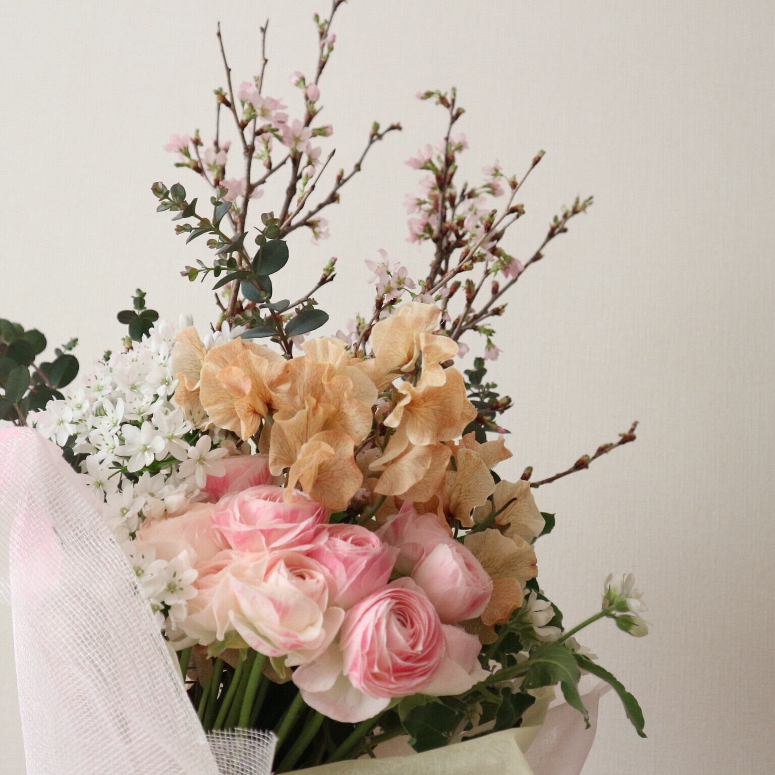 毎年定番の桜のブーケ。山形県の桜にピンクのラナンキュラス、スイートピーなど春のお花を合わせました。