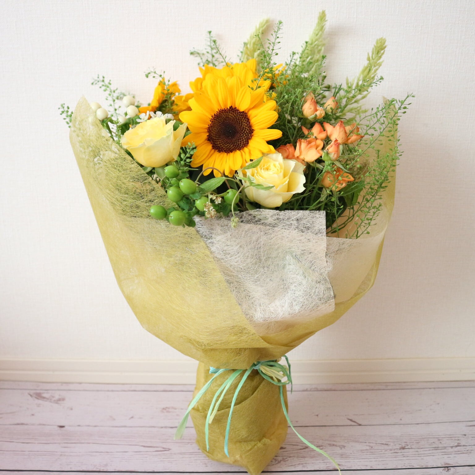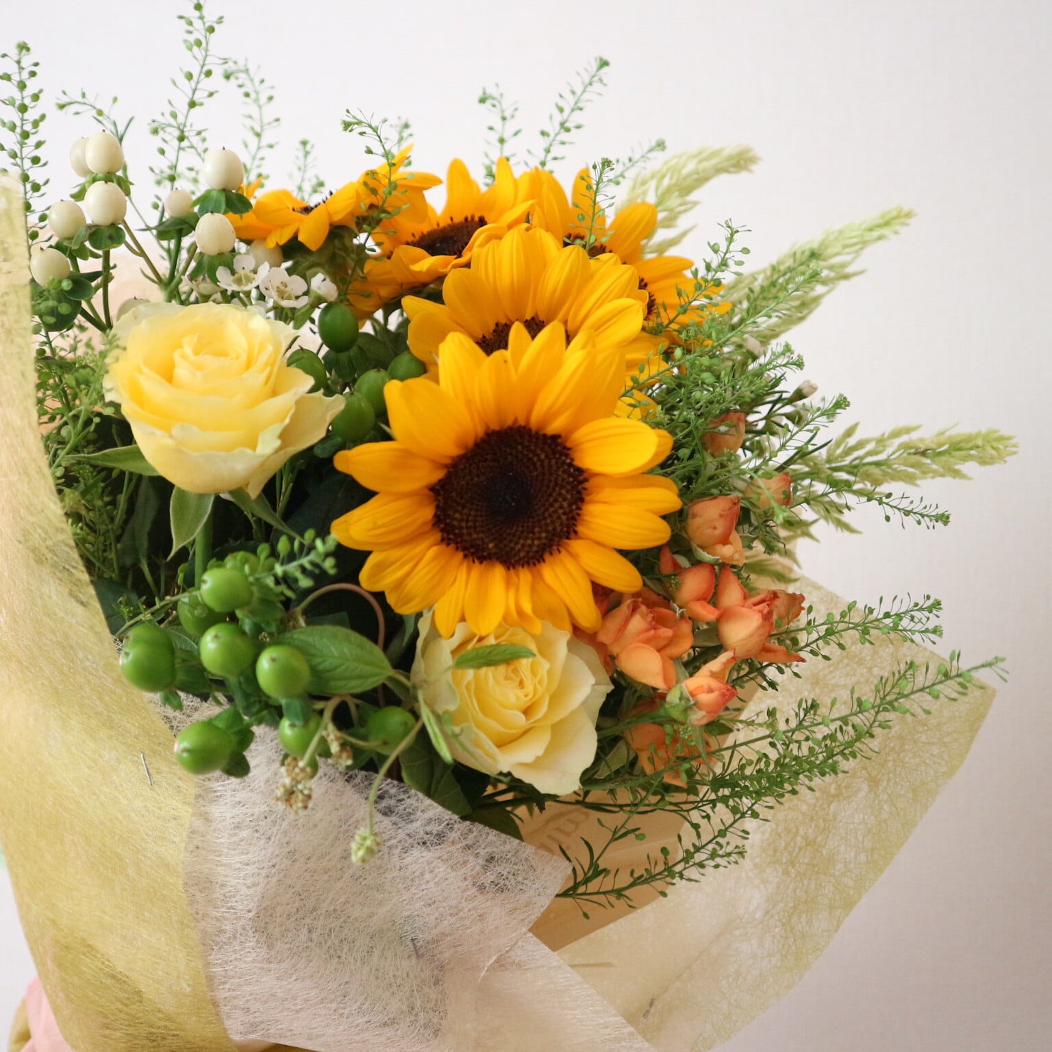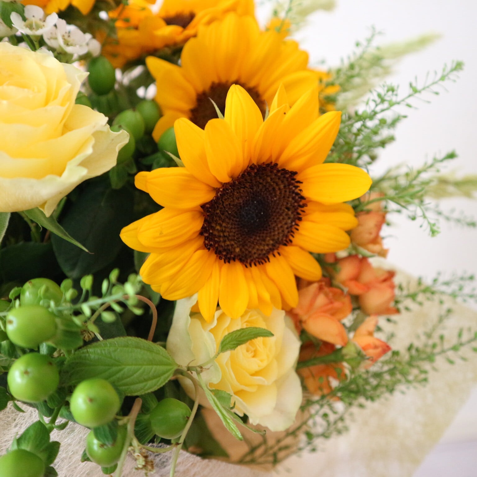 北海道岩見沢産のひまわりを、季節の草花と束ね、明るいビタミンカラーのブーケに仕上げました。