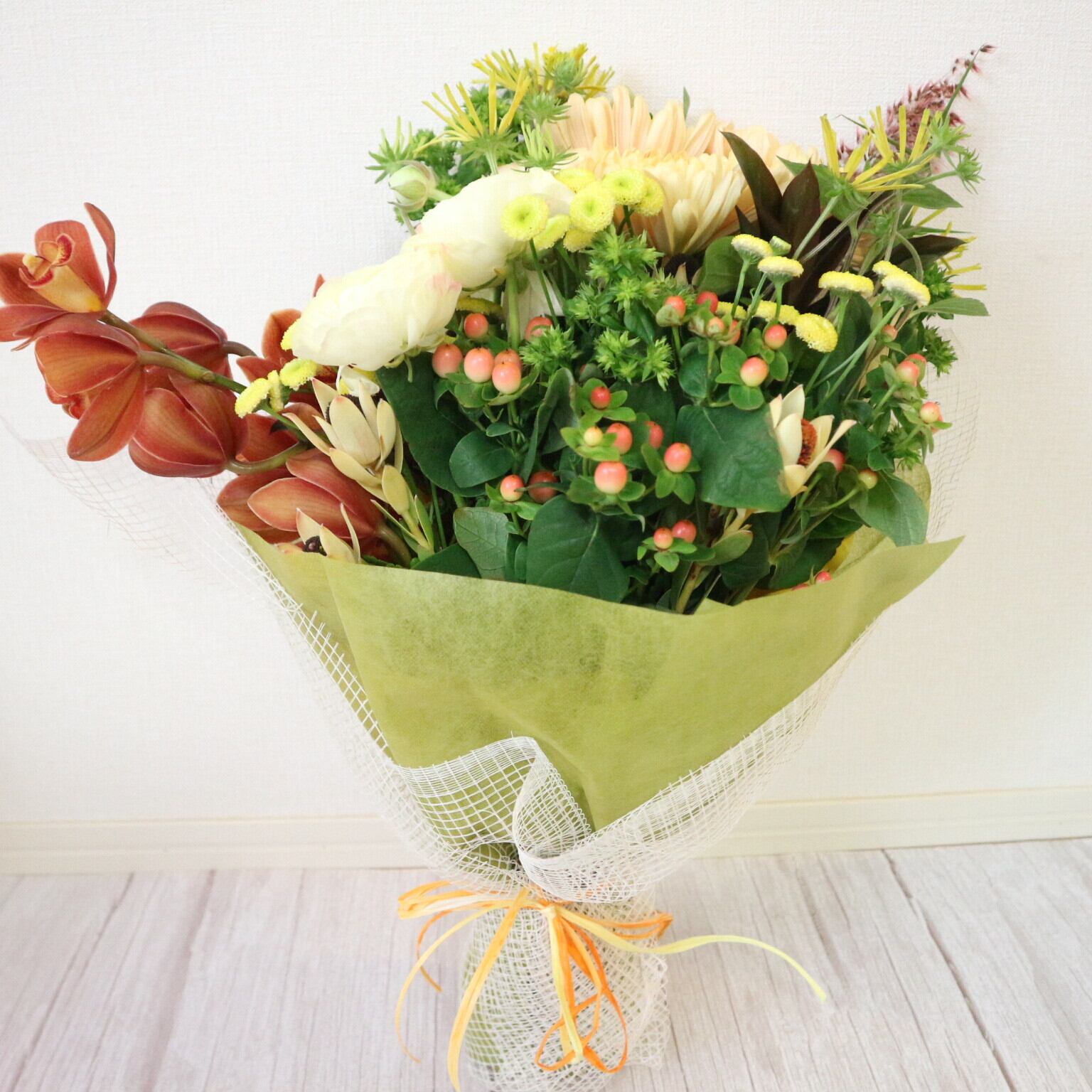 クリーム色のマムに白いラナンキュラス、ルドベキア等を合わせ、ふんわりとしたイメージに仕上げました。